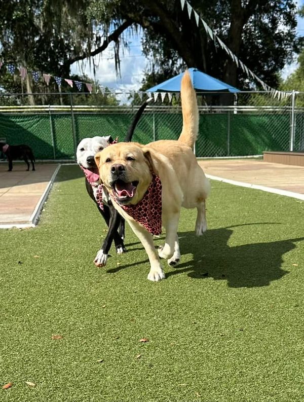 Our K9 guests enjoy outside activities 3-4 times daily! Play groups are carefully selected, according their size and temperament. Staff members are present playing fetch and refereeing. A fun, bone shaped wading pool, enclosed in a tropical setting, allows your furry pals to splash around, cool off and have a blast.